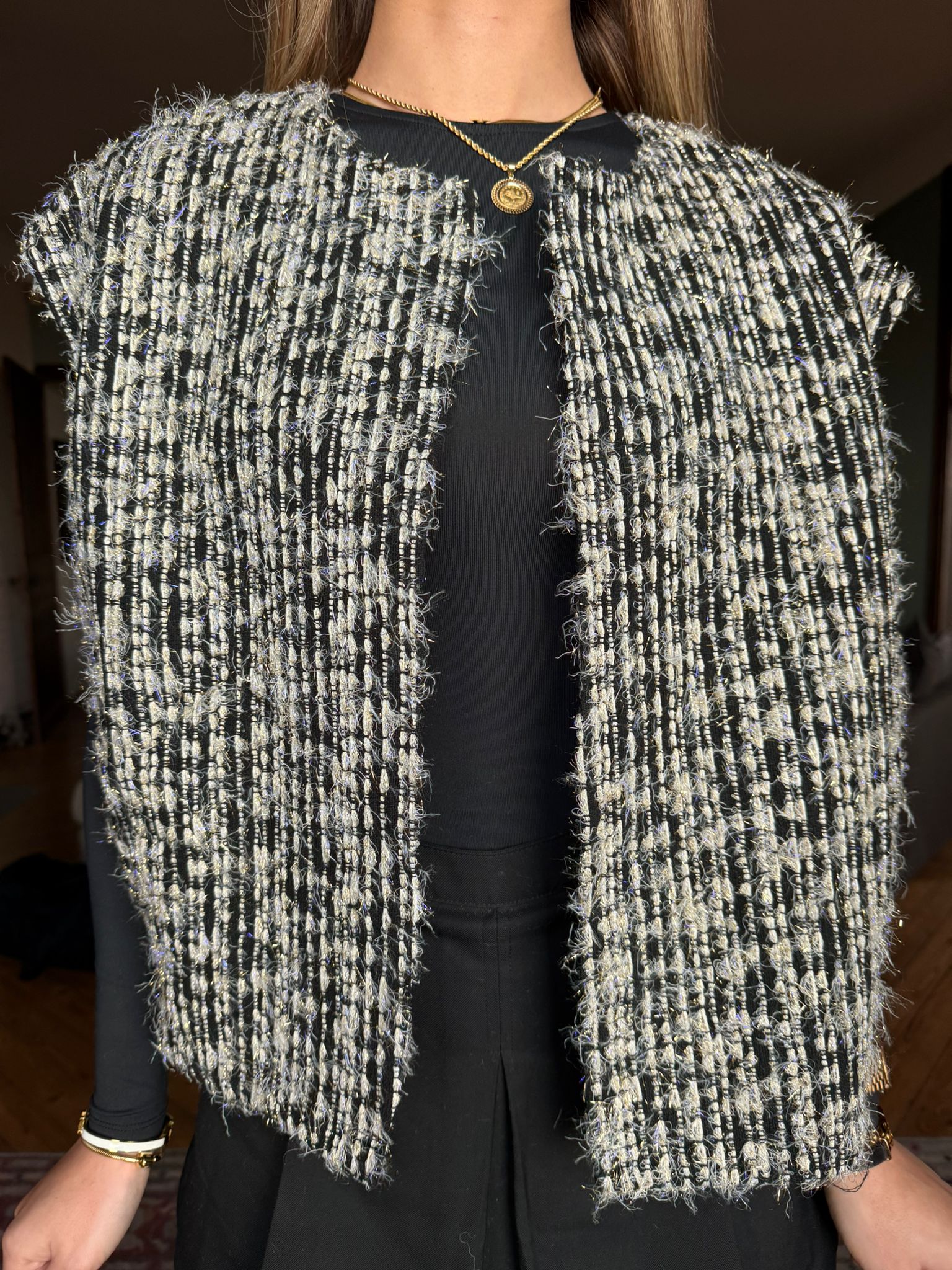 Ce gilet sans manches scintillant, est la pièce idéale pour sublimer une tenue de fête. Son tissu lumineux capte la lumière à chaque mouvement et apporte instantanément une touche chic et festive. Facile à porter, il se superpose parfaitement sur une robe, un top ou une chemise pour rehausser l’allure sans effort. Georgy est l’allié parfait pour celles et ceux qui souhaitent briller avec élégance lors des soirées et occasions spéciales.