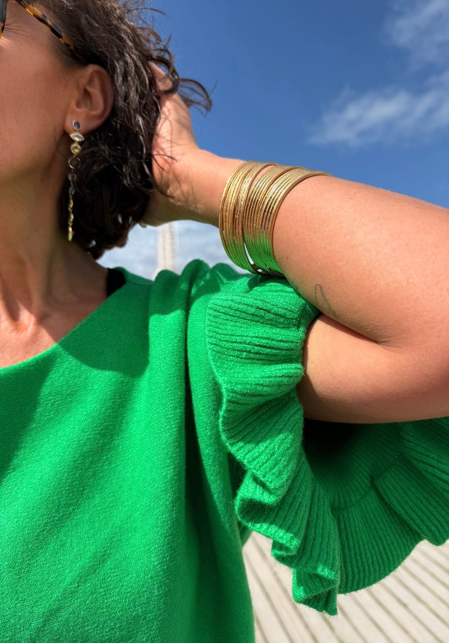Ce pull féminin et élégant est conçu pour allier confort et style. Il présente des manches 3/4, idéales pour les saisons intermédiaires, qui offrent une liberté de mouvement tout en restant chic. Le design se distingue par une forme de fleur : soit en relief, brodée ou imprimée sur le devant, créant un effet délicat et romantique.