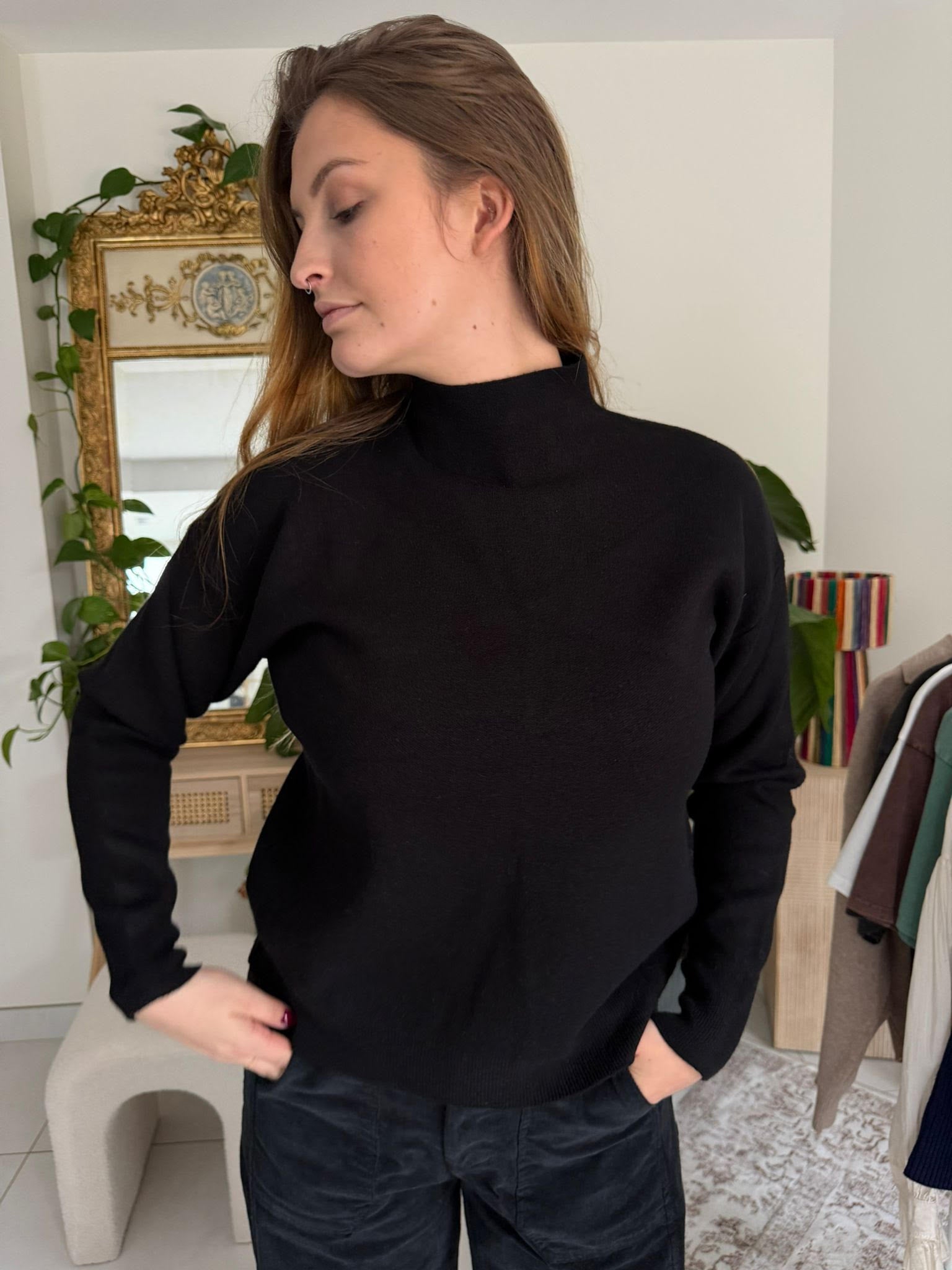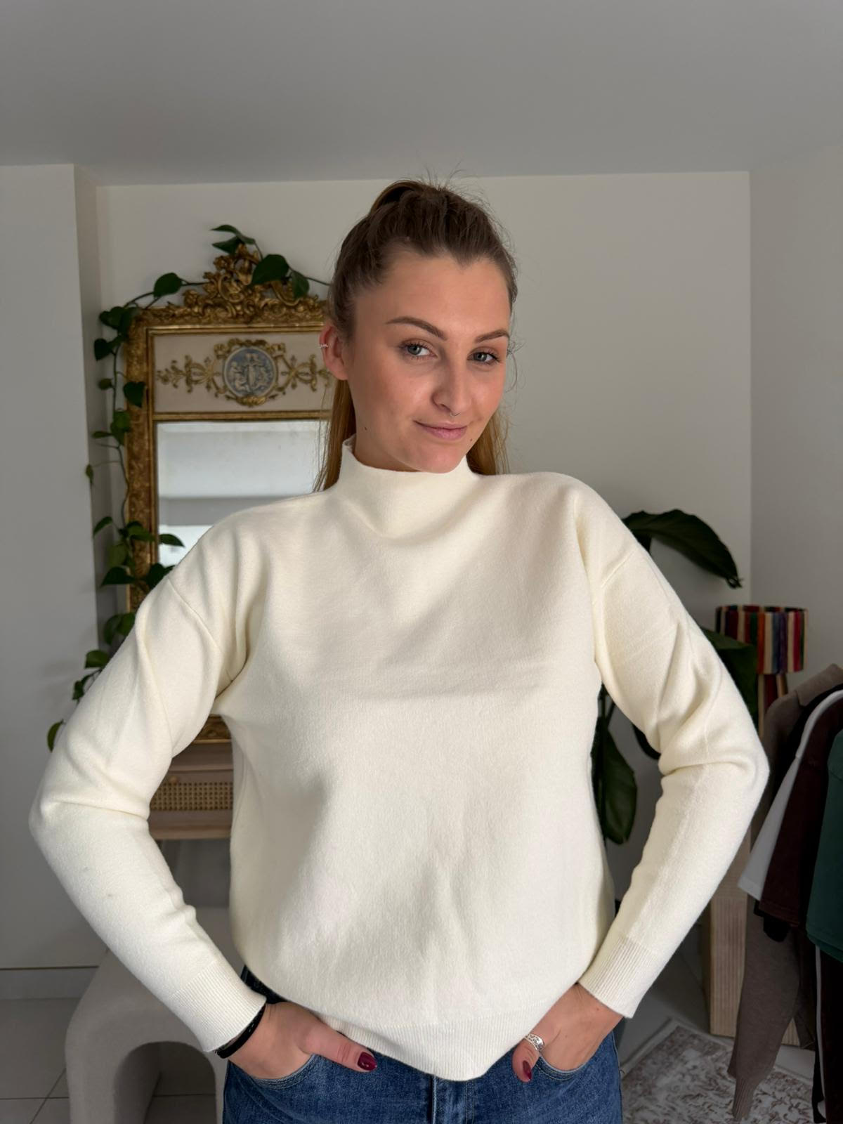 Pull à manches longues avec col légèrement montant, alliant douceur et confort. Confectionné dans une maille moelleuse qui caresse la peau, il offre une silhouette élégante et cosy, parfaite pour un porté quotidien tout en restant chic.