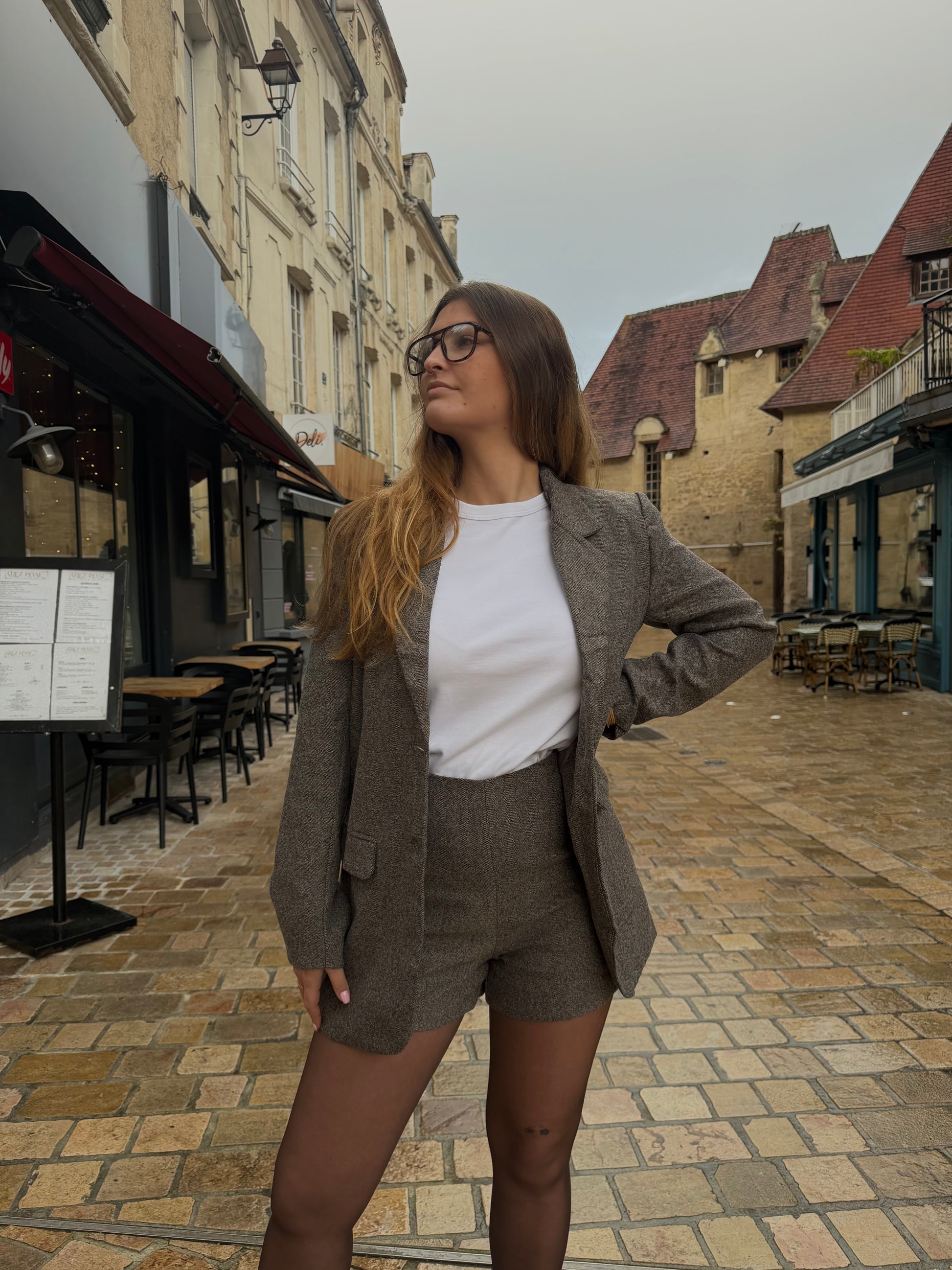 Ce short d'ensemble imprimé chevron, au ton beige marronné incarne l'équilibre parfait entre élégance et décontraction.